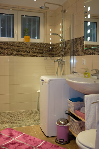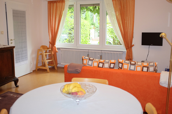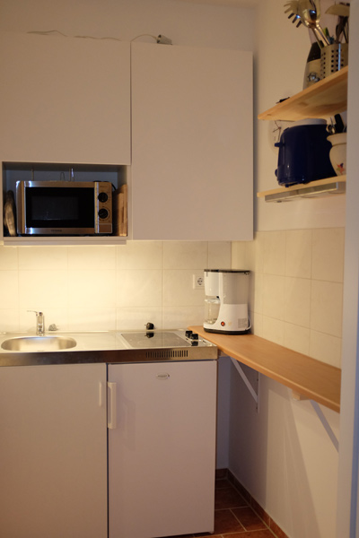 Whereas the living room is equipped with a sofa bed (for 1-2 further kids) and cable tv you will find a king size bed in the separate bedroom. Next to the pantry kitchen you will find the luxurious bathroom with your shower, toilet and your own washing machine. The whole flat is equipped with free wifi and you will find parking slots directly in front of the door.